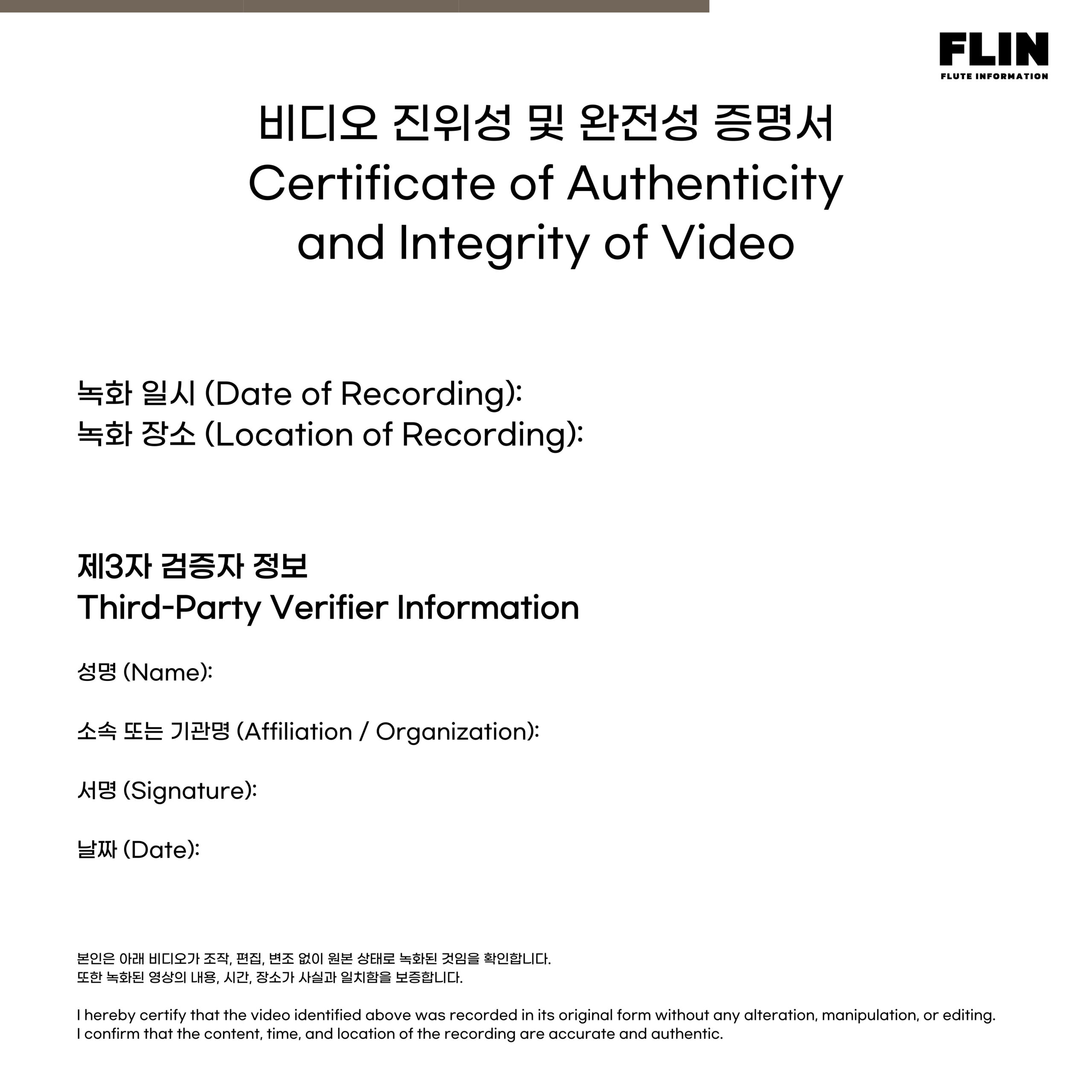 Festival Flute Competition 2026 1'ST FLIN FESTIVAL FLUTE COMPETITION Apply via Google Form / 구글 폼으로 콩쿠르 참가 신청하기 Download Competition Guideline / 콩쿠르 요강 다운로드 Certificate of Authenticity and Integrity of Video / 비디오 진위성 및 완전성 증명서